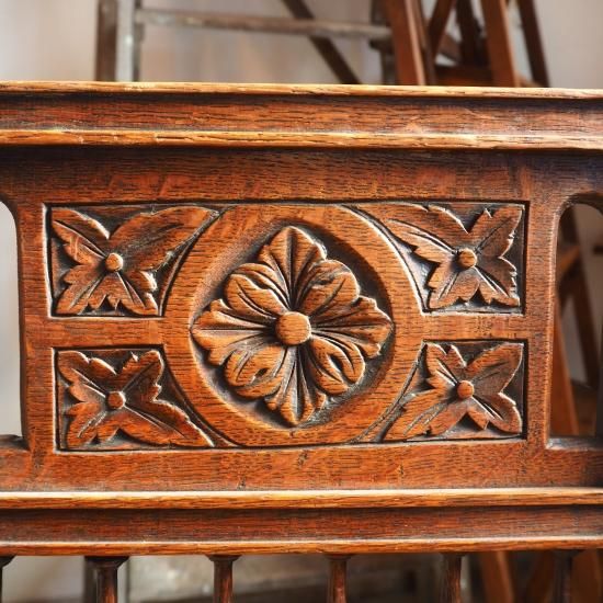 優雅で上品な佇まい、背もたれに施された手彫りのモチーフが素敵です。