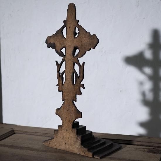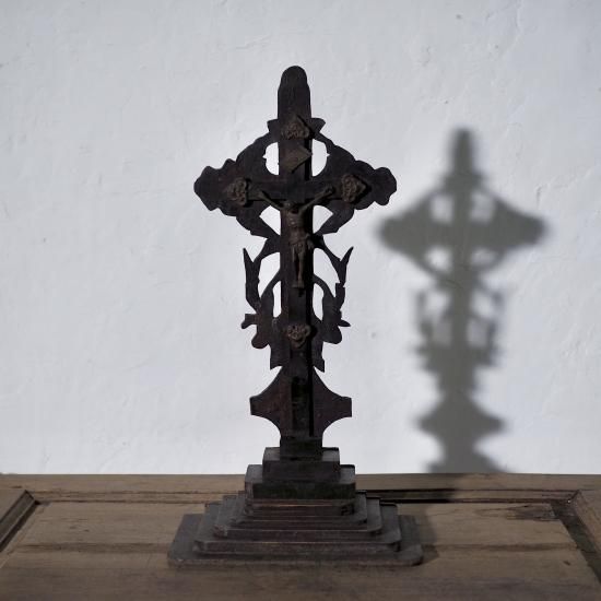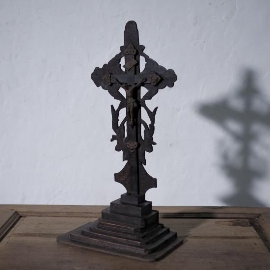 装飾的なシルエットの黒い十字架に、素材感の異なる金属製のオブジェを遇らった、やや大ぶりで存在感のあるお品。